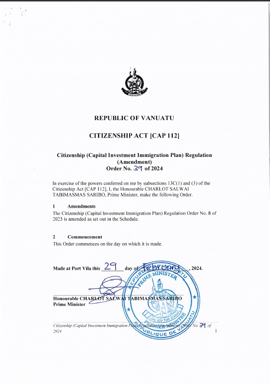 為了推動瓦努阿圖經濟發展和吸納高質素的新移民,瓦努阿圖政府根據《國籍法第112章》第13C,於2024年2月頒布《2024年第39號資本投資移民計劃》修訂法令,制定了資本投資移民計劃其中卡瓦補助支援計劃法案。根據修訂法令2024年第39號第2(2)條附例C段,允許有意入籍瓦努阿圖的申請人向政府指定的項目投入10萬美元*作支援卡瓦農業發展,在得到入籍委員會批准後並向政府支付相關申請費用後,便可獲得瓦努阿圖公民身份。